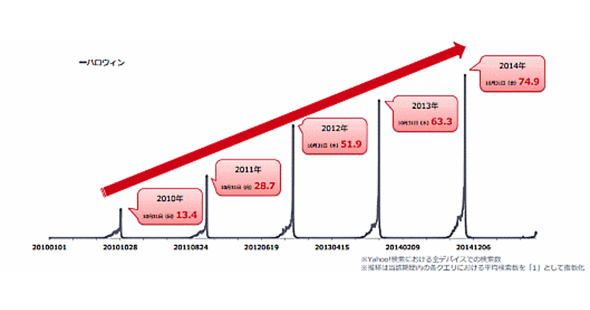 ヤフーのデータ(下図)からは、年々右肩上がりで「ハロウィン」関連のキーワードが上昇していることがわかります。ヤフーによると、「今年も過去同様に検索数の上昇が予想される」ということです。