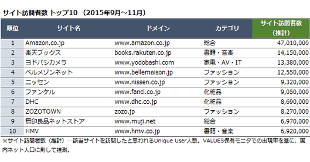 サイト訪問者数、訪問回数はPCからのアクセスを集計し、「カテゴリ」はヴァリューズが独自に定義したものです。