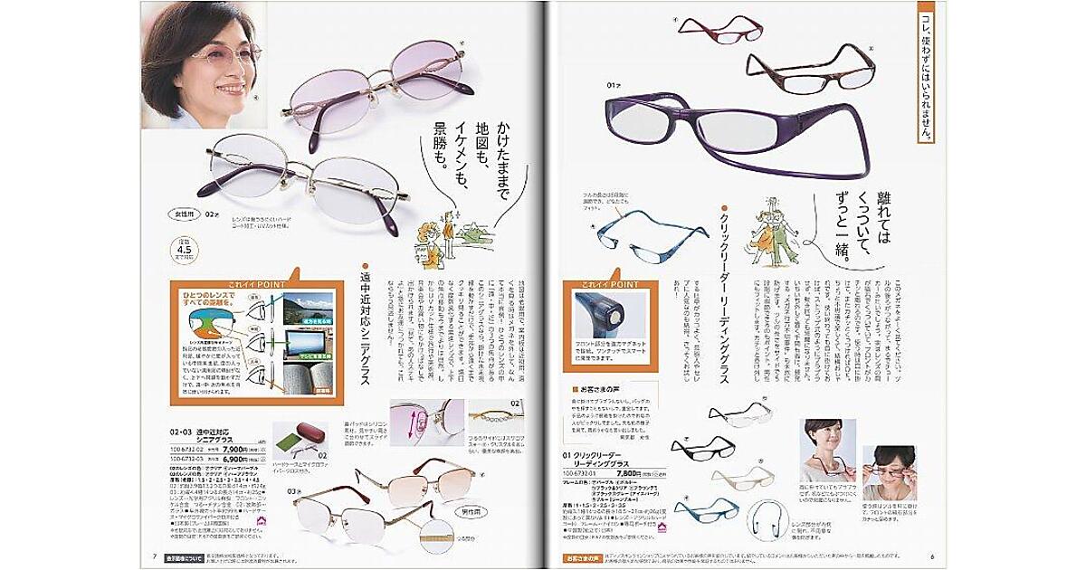 例えば6ページに掲載するメガネの中央が磁石で離れ、着脱が簡単な「クリックリーダー リーディンググラス」では、男女のダンサーのイラストとともに「離れてはくっついて、ずっと一緒」とのコピー。「これイイPOINT」ではメガネ中央の磁石部分の接写画像とともに「フロント部分を強力マグネットで接続。ワンタッチでスマートに開閉できます。」と説明している。7ページ掲載の「遠中近対応シニアグラス」では女性が山と男性を見ているイラストとともに「かけたままで地図も、イケメンも、景勝も。」とのコピー。「これイイPOINT」ではレンズの上部が遠用、中央が中間、下部が近用とすべてに対応するレンズの特徴を図解入りで説明している。