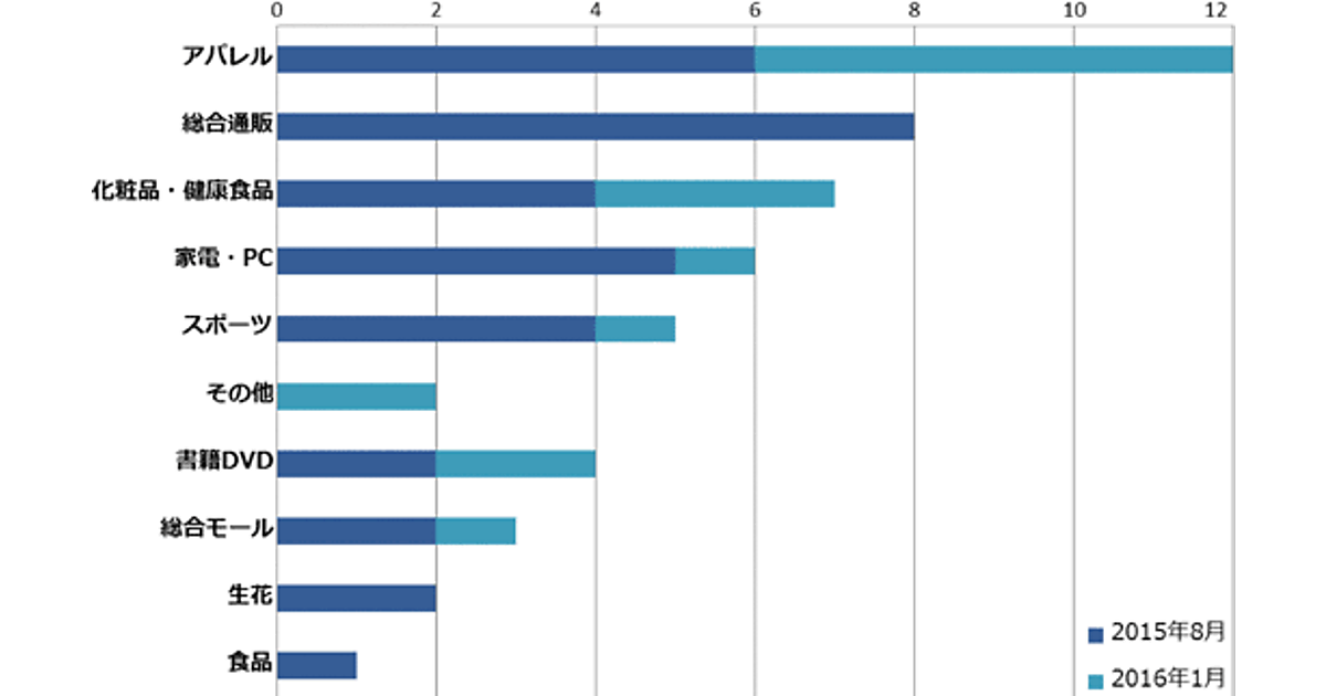 また50サイトを業種別にすると、普及率が高い順にアパレルが12サイトと24%を占め、続いて総合通販(8サイト/16%)、化粧品・健康食品(7サイト/14%)、家電・PC(6サイト/12%)、スポーツ用品(5サイト/10%)となった。