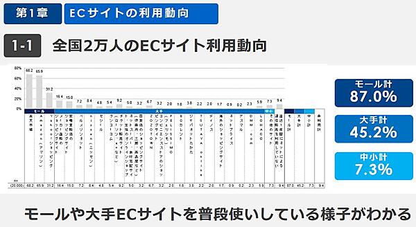 全国2万人のECサイト利用者のうち、87%が「楽天市場」「Amazon.co.jp」などのモールを利用。伊勢丹、ベルメゾンネット、ケンコーコムといった大手の自社ECサイトを利用したことがある人が45.2%、中小のECサイトの自社サイトを利用したことがある人は7.3%にとどまっている。