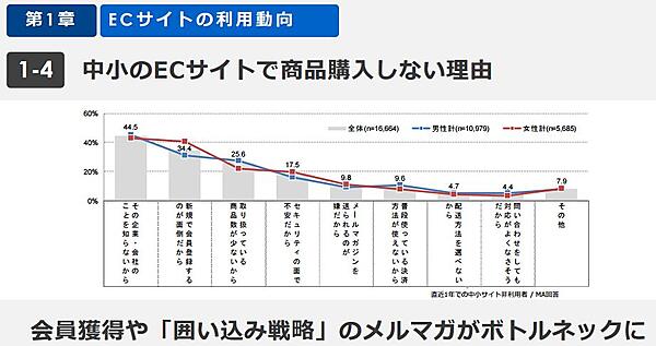 また、中小のECサイトで購入しない理由について聞いたところ、「その企業のことを知らないから」「新規で会員登録するのが面倒だから」といった理由が上位に入った。
