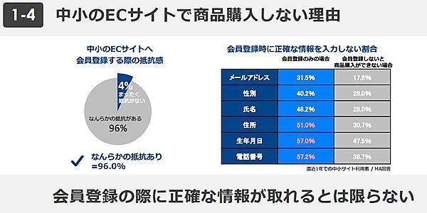 中小のECサイトへ会員登録するのに抵抗があると回答したユーザーは96%。会員登録しないと商品購入できない場合でも、メールアドレスや住所といった情報をわざと間違って入力するユーザーが相当数いるということも明らかになった。