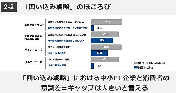 一方、中小EC企業に消費者行動について聞いたところ、「消費者は会員登録を嫌がっていない」と考えている企業は約半数にのぼる。消費者との意識の差が大きいことも明らかになった。