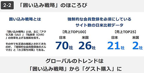 米国でも会員登録を嫌がる消費者が増えており、ECサイトはこうした状況に対して2年ほど前から対応を始めているという。日本の売上TOP100社のサイトの内、70社が強制的な会員登録を必須にしているのに対し、米国では26社のみ。TOP25に絞ると日本は21社、米国では2社。