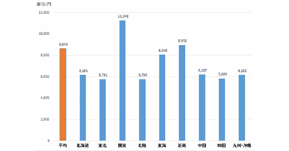 最も低いのは北陸で5750円。僅差であるが東北が5751円で上回っている。