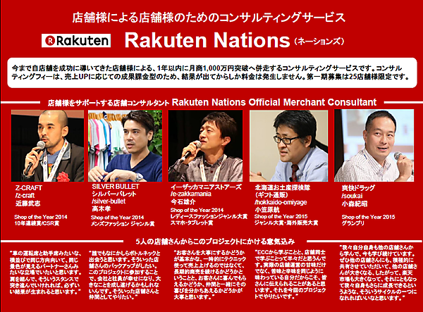 コンサルティングを行うのは、楽天で有力店舗を運営する5人。「Z-CRAFT」の近藤武志氏、「SILVER BULLET」の高木孝氏、「イーザッカマニアストアーズ」の今石雄介氏、「北海道お土産探検隊」の小笠原航氏、「爽快ドラッグ」の小森紀昭氏。それぞれ5店舗ずつコンサルティングしてもらう予定です。