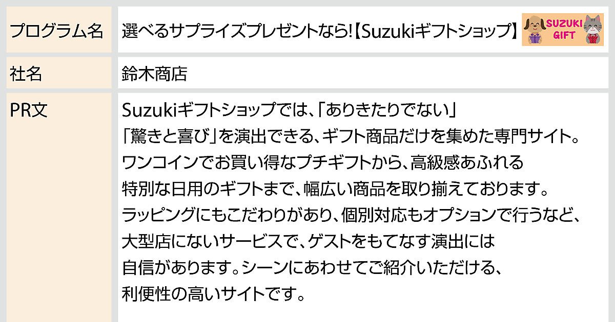 ギフトは、サイトカテゴリーに限らず、多くの方がご利用いただけます。ぜひ、あなたのサイトでSuzukiギフトショップをご紹介ください。ご提携を、心よりお待ちしております。