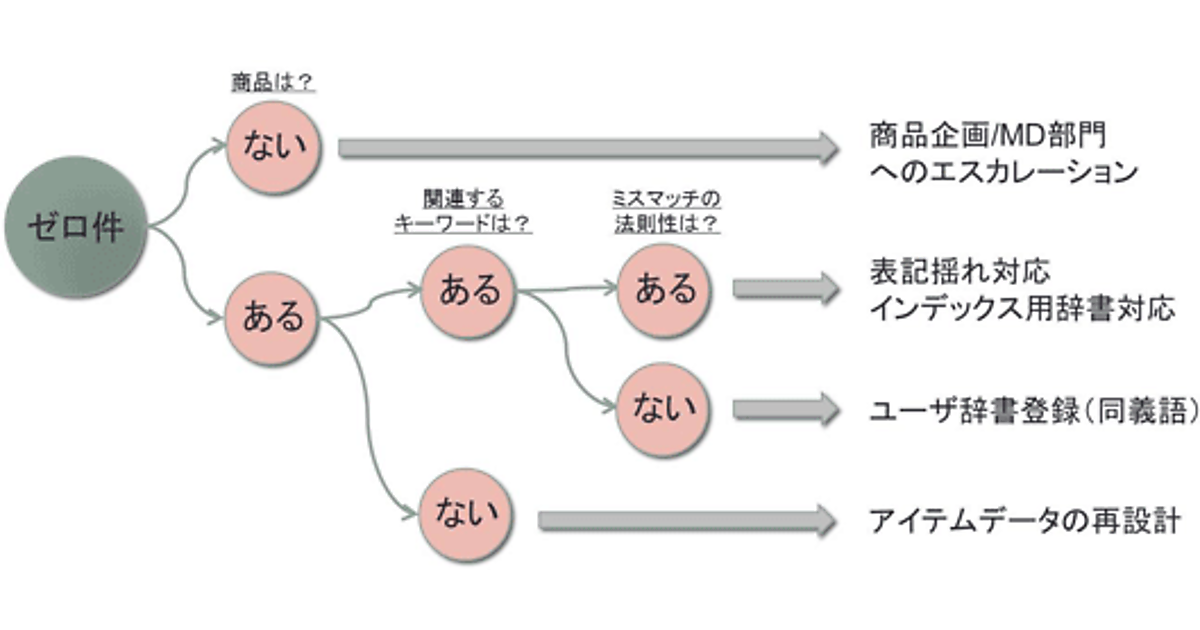 まず、取扱いのない商品を検索された結果、検索結果ゼロ件になる場合。これは結果の出しようがないですが、検索回数が多いようであれば、新たなニーズとして商品企画部やMD部にエスカレーションすると良いでしょう。