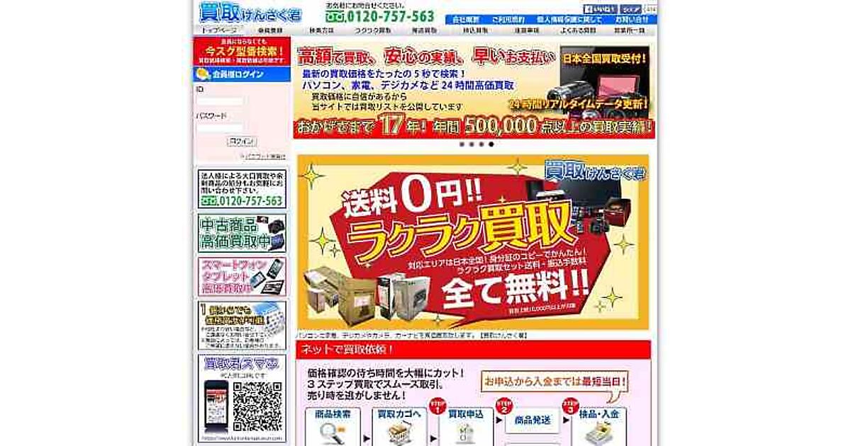 同店では、中古商品も取り扱っており、買い取り価格の検索や買い取り依頼ができるサイト「買取けんさく君」(=画像)を運営している。ただ、大手の中古家電買い取りサービスに比べると、ユーザーの認知度はまだ低いのが実情。買い取り価格での優位性を確立することで、周知を進めたい考えだ。中古の販売は新品販売に比べて利幅が大きいことから、今後も強化していく考え。