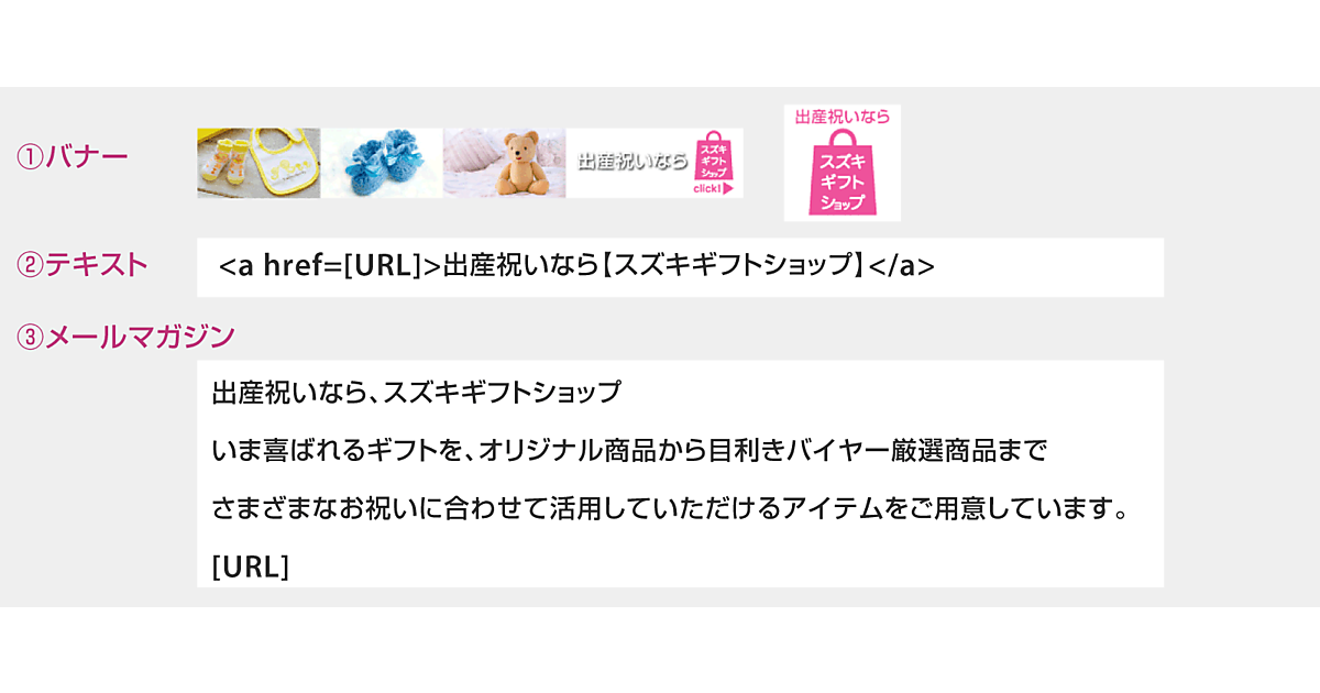 ![①バナー ②テキスト <a href=[URL]>出産祝いなら【スズキギフトショップ】</a> ③メールマガジン 出産祝いなら、スズキギフトショップいま喜ばれるギフトを、オリジナル商品から目利きバイヤー厳選商品までさまざまなお祝いに合わせて活用していただけるアイテムをご用意しています。[URL]](/sites/default/files/images/article/2016/affiliate/a09-01.png)