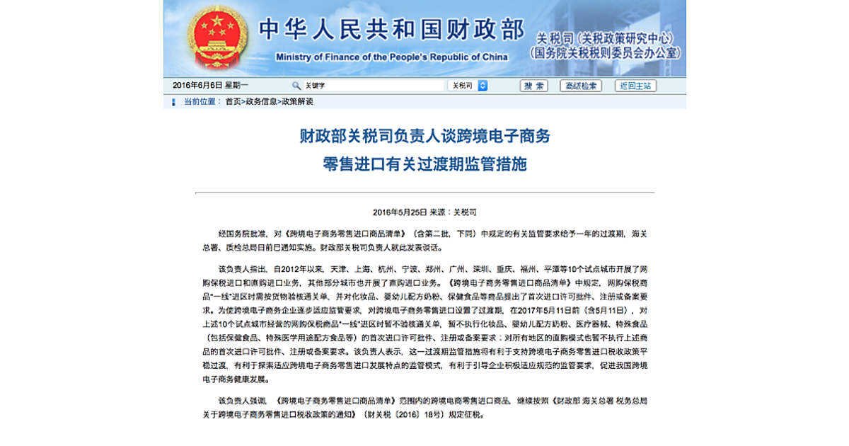 中国財務省関税管理課は5月25日、「财政部关税司负责人谈跨境电子商务零售进口有关过渡期监管措施」を通告し、越境ECにおける新政策の一部を1年間延期すると発表しました。