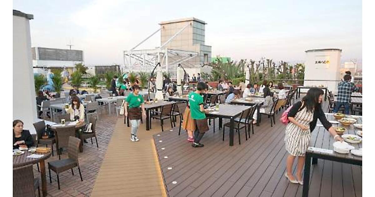 南国風のイメージでデザインされた「ユーグレナビアガーデン」は、2時間飲み放題4500円。座席数は146席で、営業時間は平日が午後4時から10時、土日祝日が正午から午後10時まで(雨天は休業)。9月末まで運営を行う。