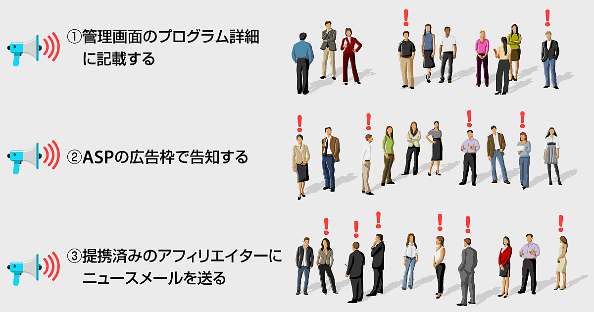 広告主からアフィリエイターへ情報提供したい時、利用できる方法は主に下記の3つです。