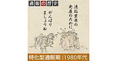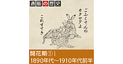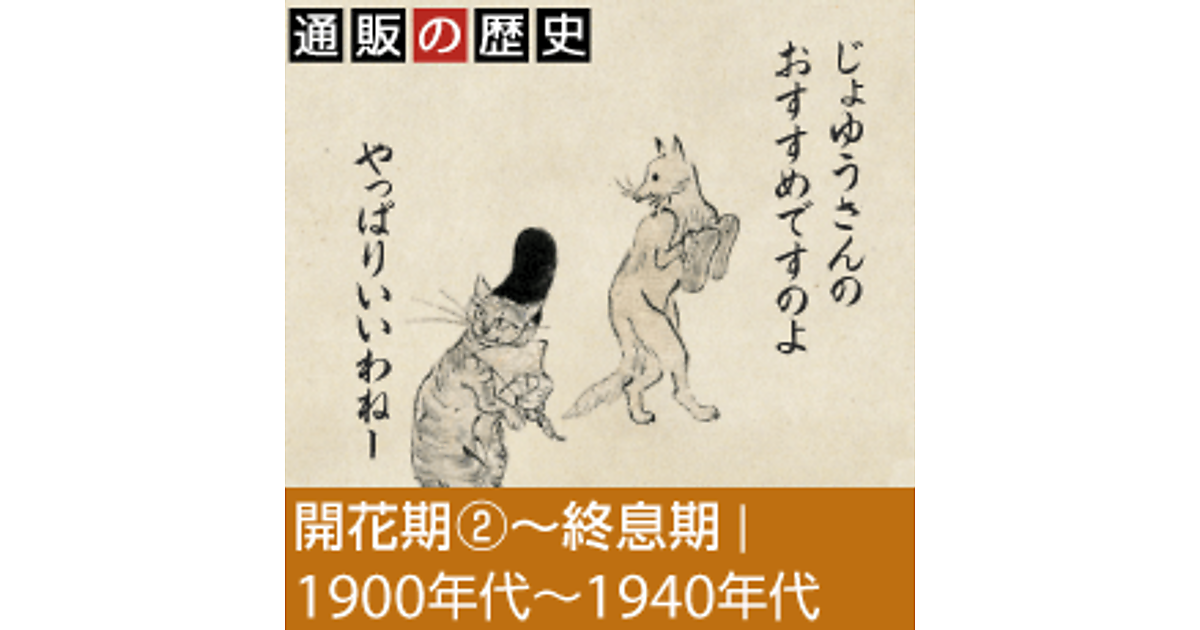 黎明期 1800年代後半 | 開花期(1)1890年代〜1910年代前半 | 開花期(2)〜終息期 1900年代〜1940年代 | 復興期〜始動期 1950年代〜1960年代 | 興盛期 1970年代 | 特化型通販期 1980年代 | カタログ通販全盛期 1990年代前半 | ネット通販勃興期 1990年代後半 | EC興盛期 2000年代前半 | 競争激化期 2000年代後半 | スマホEC勃興期 2010年代