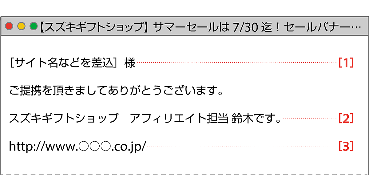 [1]差込機能が使える場合は、アフィリエイトサイト名を差し込みましょう。その際、必ず「様」を追記することを忘れずに。「うっかり呼び捨てで送信してしまった!」ということのないように注意しましょう。