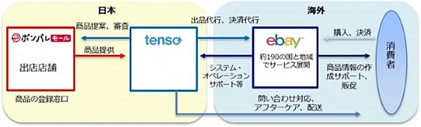 商品審査、出品代行、決済などはすべてtensoが代行する。「ポンパレモール」出店者は業務負荷を増やすことなく「eBay」で販売できるようになる。