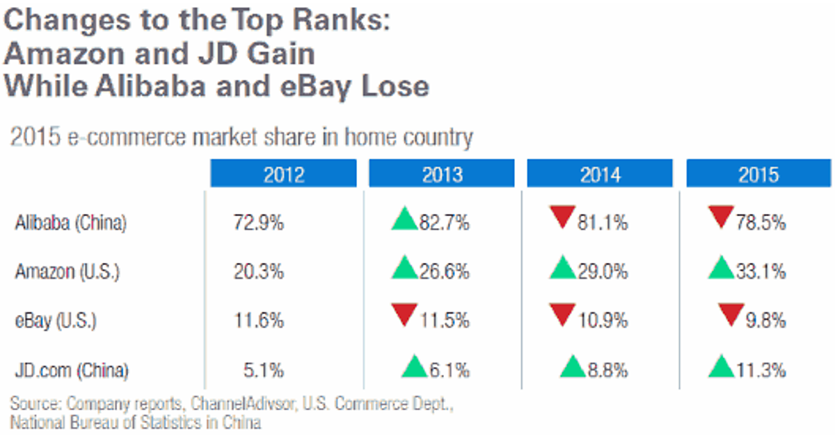 アマゾンの急成長でeBayは米国でのシェアを落とし、中国ではJD.com(ジンドン、京東集団)がシェアを伸ばしている