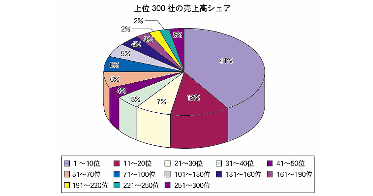 一方、別図の「上位300社の売上高シェア」は上位300社を10位(51位以降は20~50位単位)ごとの階層で区切った売上高シェアを示したもの。1~10位のシェアは昨年同時期調査と同じ41%で、売上高合計は2兆5562億円で、昨年と比べると6.1%の増加になる。