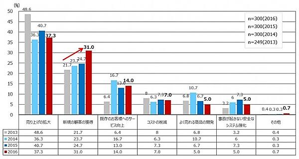 現状の課題を1つ選んでもらったところ、「売り上げの拡大」が37.3%でトップ。だが、減少傾向となっている。一方、「新規顧客の獲得」は31.0%で、年々割合が増えている。