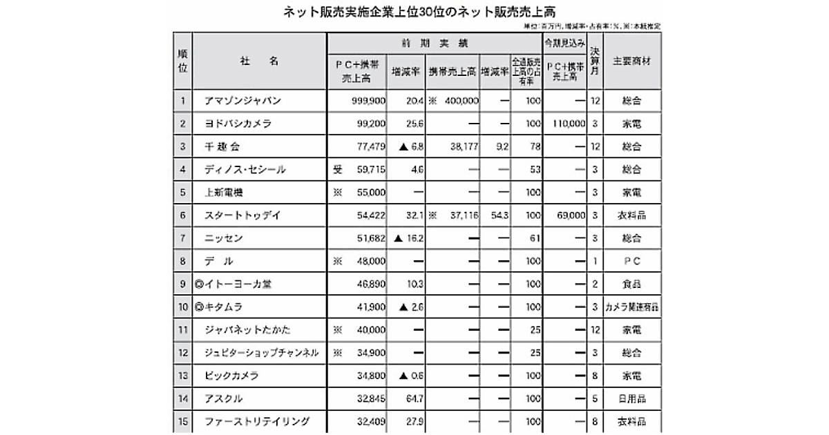 表中、企業名横の「◎」は次の理由による。(9)イトーヨーカ堂はネットスーパーの売上高(10)キタムラは宅配売上と店舗受取売上を合算した「EC関与売上」の数値(17)マウスコンピューターは店舗売上などを含む(19)MOAは卸を含む(24)T―MEDIAホールディングスはネットメディア事業、映像・楽曲配信事業、DVDレンタル事業などを含む総売上高