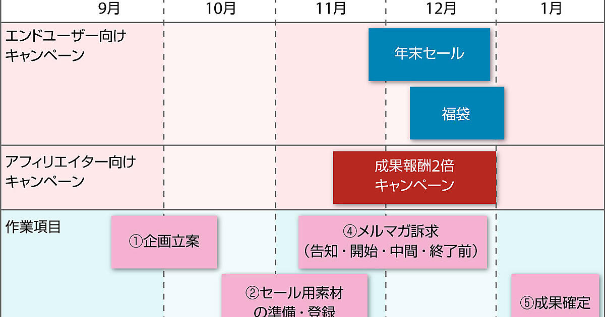 提携数が伸びない、稼働率が良くない……といった課題の解決におすすめなのが、報酬アップを中心としたアフィリエイター向けキャンペーンです。しかし、ただキャンペーンをやれば成果が上がるかというとそうではありません。キャンペーンの効果を上げるには、実施する時期がポイントになるのです。
