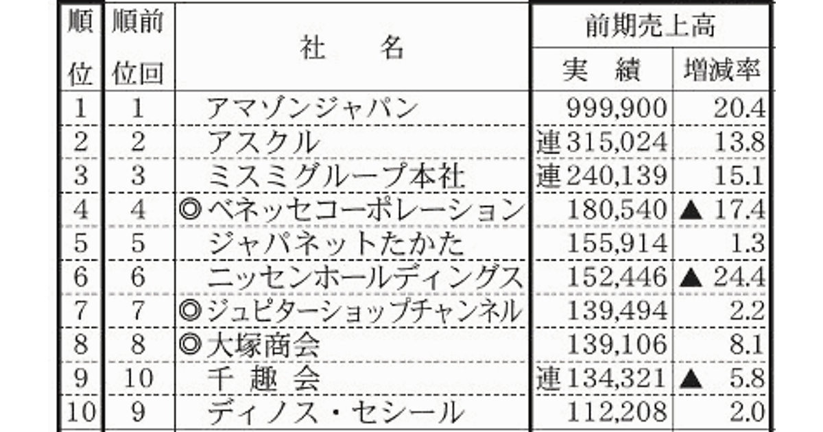 トップのアマゾンジャパンは20.4%増の9999億円となった。決算期が12月で、16年12月期は1兆円超えが確実視される。2位と3位はともにBtoB通販をメインとするアスクルとミスミグループ本社がランキングした。ミスミグループ本社は前年同期調査時3位だったベネッセコーポレーションを上回る実績で、今回は1つ順位を上げた。