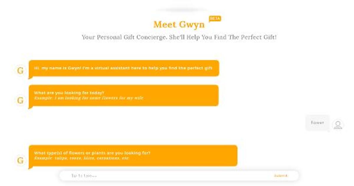 1-800 Flowers.comは、会話型コマースの可能性を高く評価し、IBMが開発したAIを搭載したオンラインのAIコンシェルジュサービス「Gwyn(グウィン)」(編集部追記:「Gifts When You Need」(必要なときに贈り物を)の略で、IBMのワトソンを活用している)などをいち早く取り入れてきました(編集部追記:Facebookが2016年4月に開催した「F8」カンファレンスでMessenger向けボットを発表した際、デモに例をあげたのが「1-800 Flowers.com 」だった)。