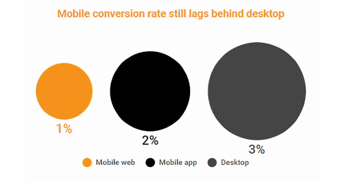 しかしながら、コンバージョン率は、デスクトップの3%、アプリの2%に比べ、モバイルブラウザ経由は1%にとどまっています。