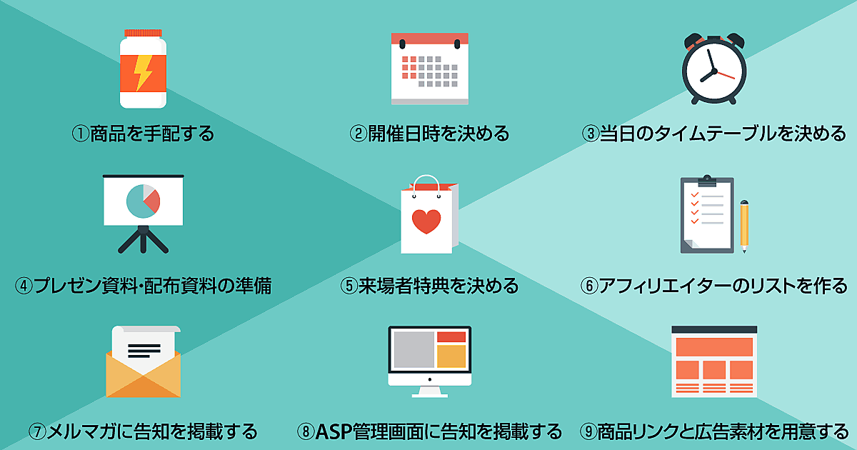 ASP主催の展示会形式イベントでも、イベントで何をやるかは広告主が企画します。 当日の展示品の準備やスタッフのアサインだけではなく、開催後にアフィリエイターが活動したくなるような企画を考えましょう。