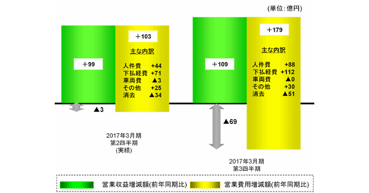 親会社のヤマトホールディングスは今期(17年3月期)第3四半期決算でデリバリー事業を中心に想定以上の業務量となり、特に都市部で物量が集中したためにコストを要して減益になった。さらに通期でも利益面を下方修正し、2期連続の減益となる見通し。人手不足の深刻化が業績面へ影響しているため、荷受量抑制を含めた対応に動かざるを得ない状況にあると見られる。