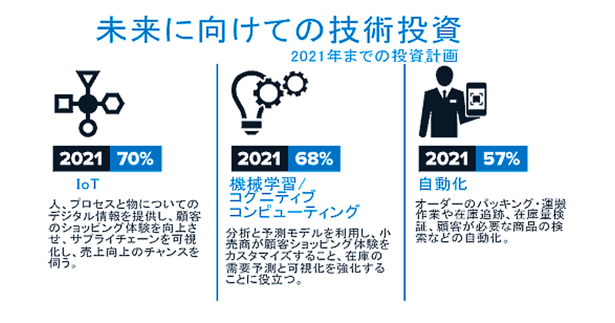 消費者の期待の変化、技術の進歩が著しい中、全世界の小売企業は変わりつつあります。IoT、機械学習、コグニティブコンピューティング、自動化は小売企業が最も関心を持っている技術トレンドです。