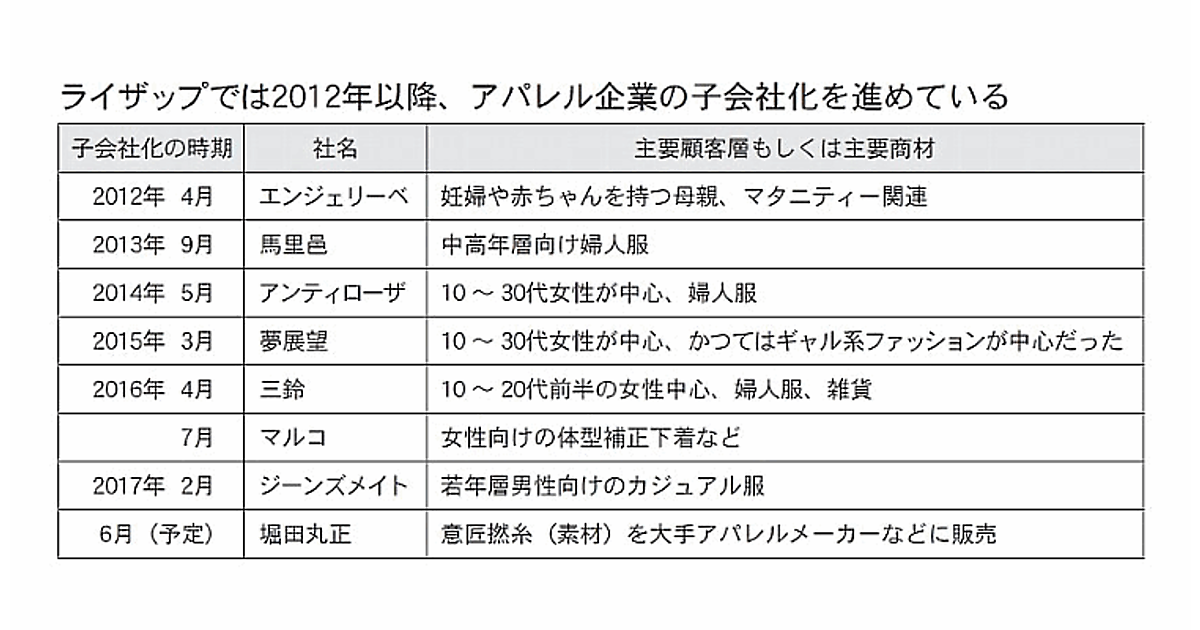 RIZAPグループ(以下、ライザップ)では、2012年のエンジェリーベ買収を皮切りに、今年5月に子会社化することを発表した堀田丸正も含めると、7つのアパレル関連企業を買収している(表のうち、マルコのみ美容・健康関連事業に入るため除外)。