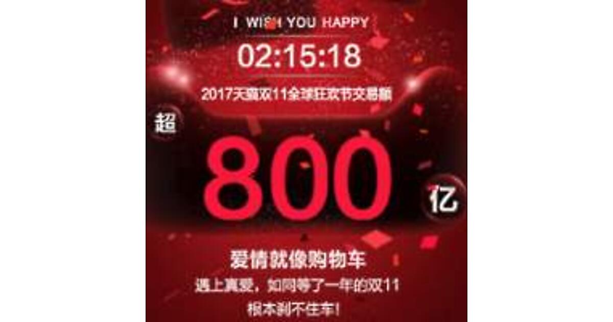 ネット通販の買い物の祭典「独身の日」(W11、ダブルイレブン)が行われている中国で、中国EC最大手の阿里巴巴集団(アリババグループ)の取扱高(GMV)はスタートから2時間15分で、800億元(日本円で約1兆3600億円、1元17円換算)を突破した。