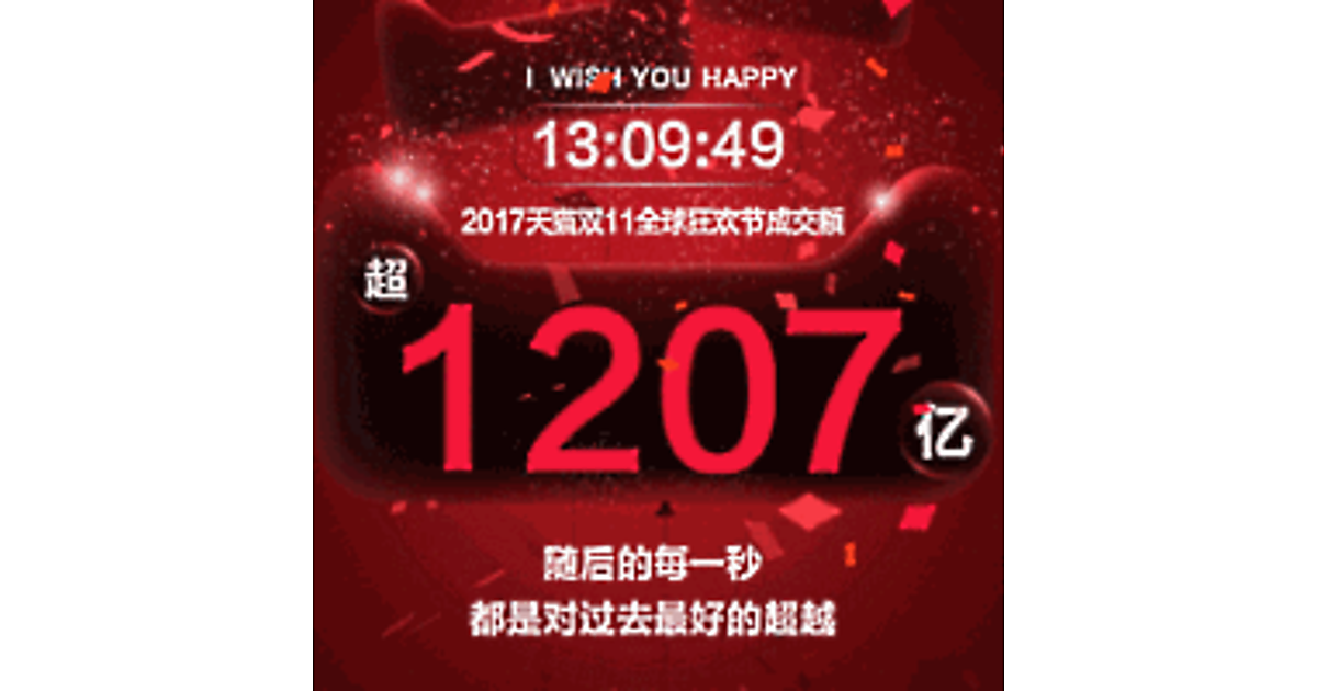 1207億元は2016年の「独身の日」1日で記録した取扱高。2017年はわずかスタートから13時間後に前年実績を上回った。