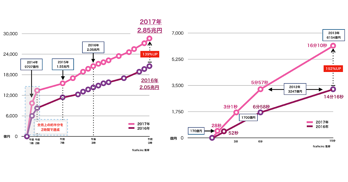 今年はそのスピードがさらに加速し、開始から2時間で2015年の総取扱高を達成し、3時間で2016年の総取扱高を達成しました。