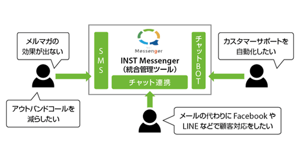 「INST Messenger」に搭載されたBot機能はLINEやFacebookと連携。消費者とのやり取りをメッセンジャー経由で行うことができる(やり取りは統合管理ツール上で一元管理できる)。