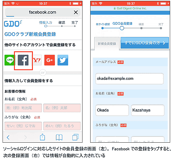 ソーシャルログインに対応したサイトであれば、各SNSプロバイダから取得できる情報で登録フォームの内容を埋めることができるので、ユーザーは会員登録作業のほとんどをタップ操作で進めることができます。