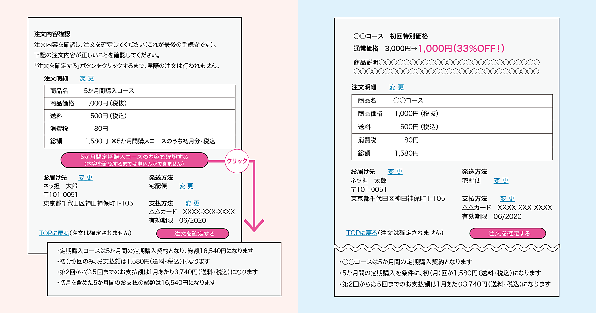 申し込みの最終画面に定期購入契約のすべての内容が表示されていない。または、容易に認識できないほど離れた場所に表示されている。