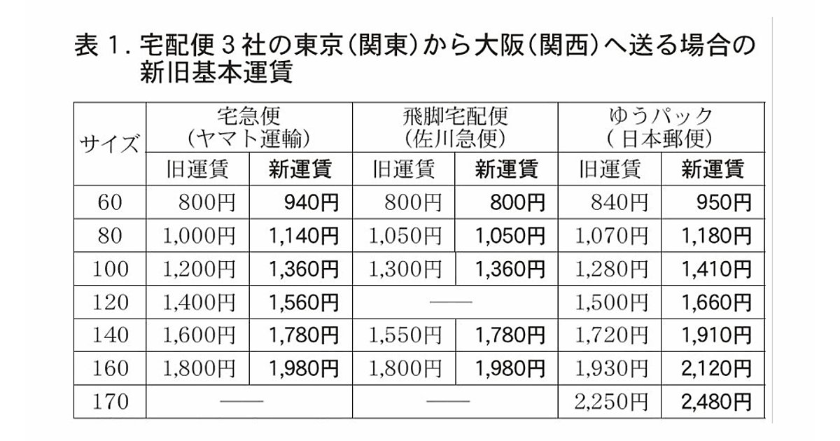 他の2社の基本運賃の上げ幅はヤマト運輸の「宅急便」が140~180円で平均約15%、佐川急便の「飛脚宅配便」が60・80サイズの運賃を据え置き、大型の100・140・160サイズを引き上げた。同社の上げ幅は0~230円で平均約7%アップとなっている。関東から関西に80サイズを送った場合の料金はヤマト運輸が1000円から1140円に、佐川急便は変更なしの1050円となる。佐川急便は大型荷物が多いため大型を抑制する狙いから100サイズ以上のみを値上げしたと見られる。
