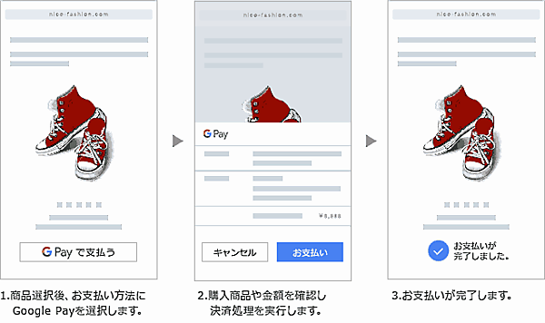 「Google Pay」は、Googleアカウントに登録したクレジットカード情報で支払いを行う決済サービス。ECサイトなどでの決済時にカード情報を入力する必要がないため、支払いの手順が簡素化され、離脱率の抑制が期待できる。