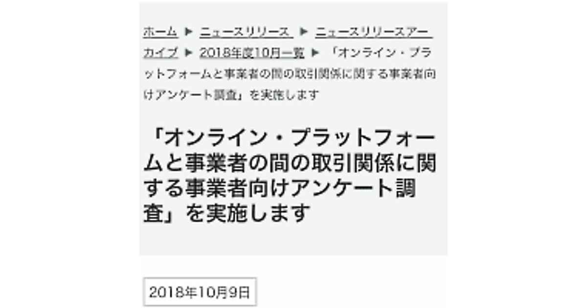 名称は「オンライン・プラットフォームと事業者の間の取引関係に関する事業者向けアンケート調査」。アンケート対象はECモール、アプリ・音楽・映像・書籍等のコンテンツストア、オンライン旅行・レストラン予約サービスなどを利用してる事業者を想定している。