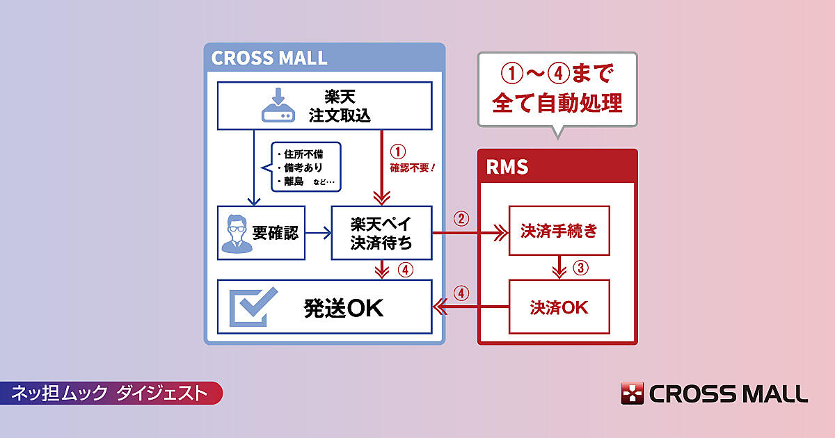 さらに、移行期間の真っ只中である楽天ペイ(楽天市場決済)への対応(図1を参照)。不備のない注文であれば、注文を自動で取り込み(①)~(④)の発送承認までを全て自動で処理する。本来は楽天ペイへの移行で作業フローが大幅に変わるが、「CROSS MALL」導入店は設定によって作業フローに大きな変化を起こすことなく、受注処理が可能となる。