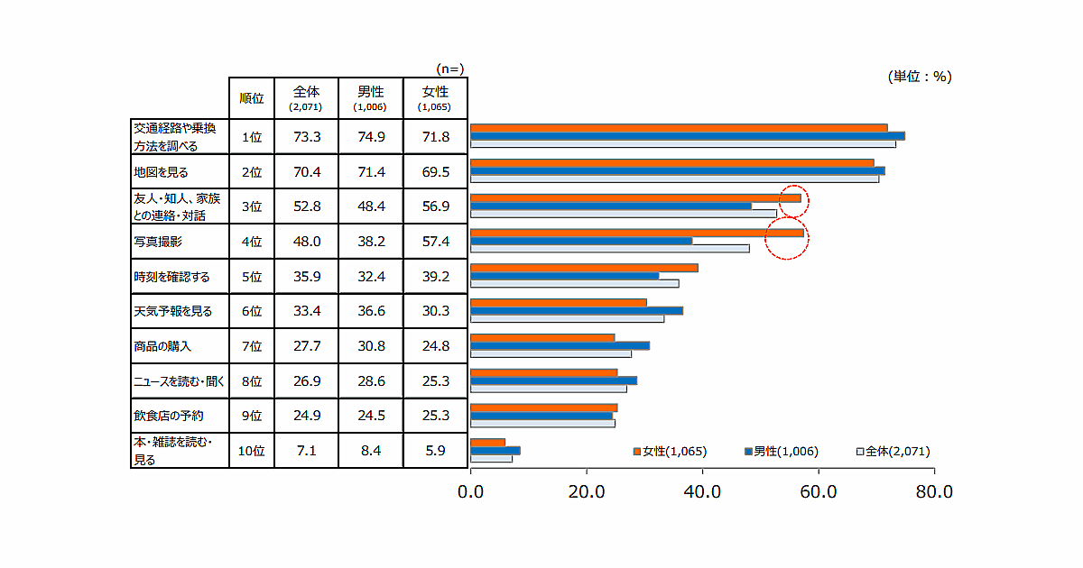その他の質問項目におけるオンラインの割合は、「友人・知人、家族と連絡・対話をする」が約50%、「ニュースを読む・聞く」と「天気予報を見る」がそれぞれ約30%、「飲食店の予約をする」が約25%、「本・雑誌を読む・見る」が約7%だった。