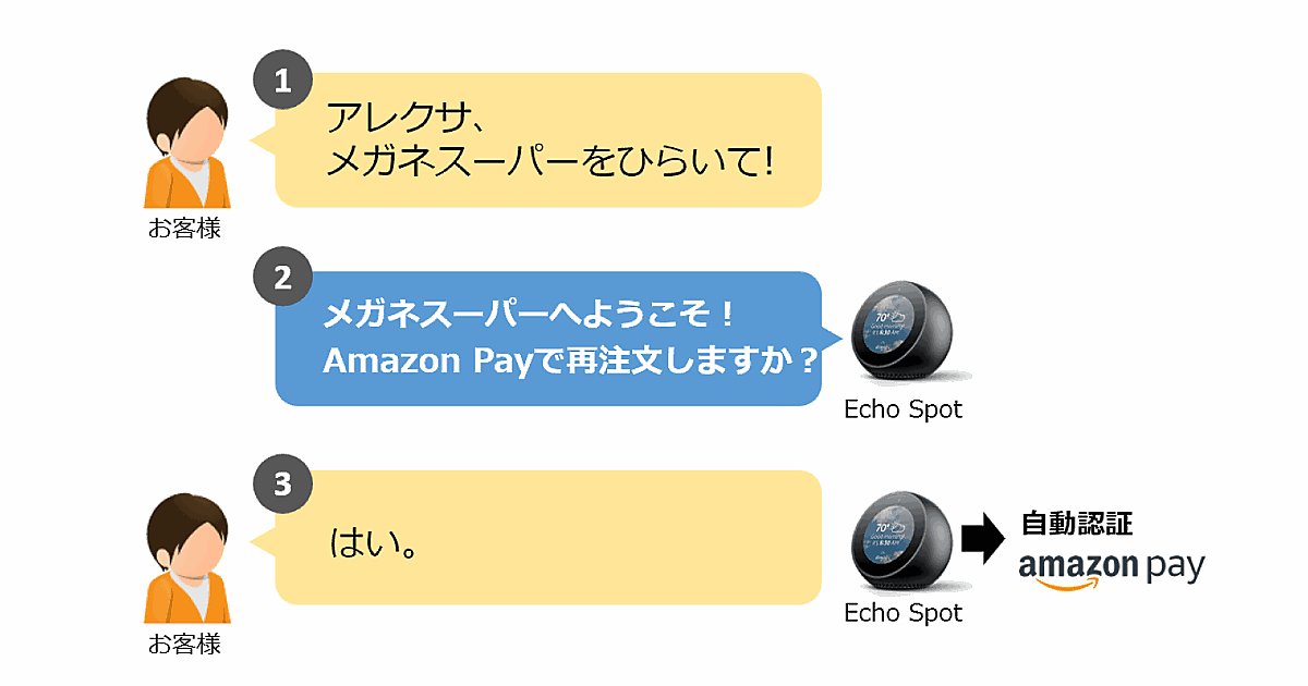 「Amazon Alexa」搭載デバイスに「アレクサ、メガネスーパーをひらいて」と話しかけると「Alexaスキル」が起動。アレクサが「メガネスーパーへようこそ!コンタクトレンズやケア商品をAmazon Payで再注文できます。再注文しますか?」と質問してくる。