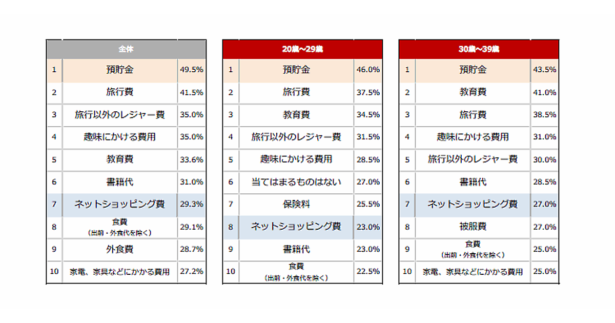 一方、「家計で減らしたいもの」のランキングのうち、20代の9位と40代の10位に「ネットショッピング費」がランクインしている。