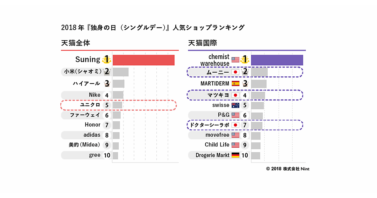 「天猫」のショップランキングでは1位が「Suning」、2位が「小米」、3位が「ハイアール」、4位が「Nike」、5位が「ユニクロ」だった。