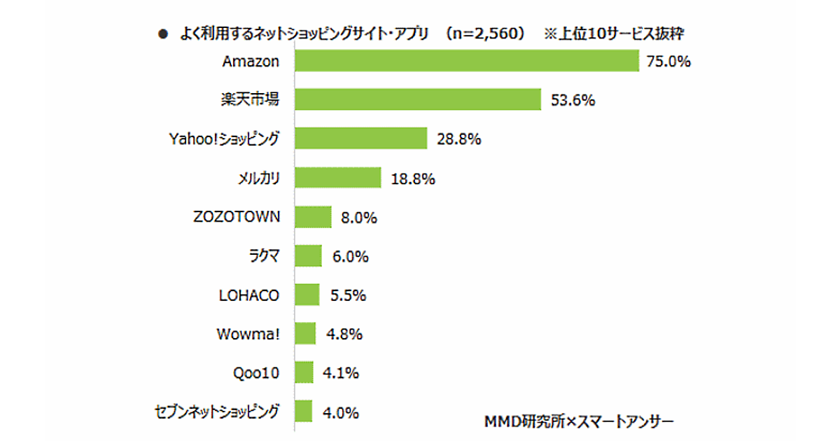 利用割合が高い順に「Amazon」(75.0%)、「楽天」(53.6%)、「Yahoo!ショッピング」(28.8%)、「メルカリ」(18.8%)、「ZOZOTOWN」(8.0%)、「ラクマ」(6.0%)、「LOHACO」(5.5%)、「Wowma!」(4.8%)、「Qoo10」(4.1%)、「セブンネットショッピング」(4.0%)となっている。