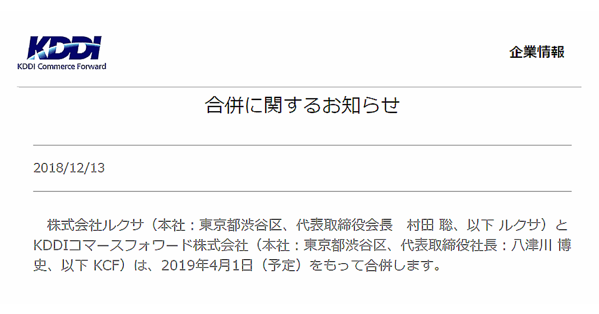 ルクサが存続会社となり、KDDIコマースフォワードが消滅会社となる吸収合併方式を採る。合併会社の社長にはKDDIコマースフォワードの八津川博史社長が就任する予定。