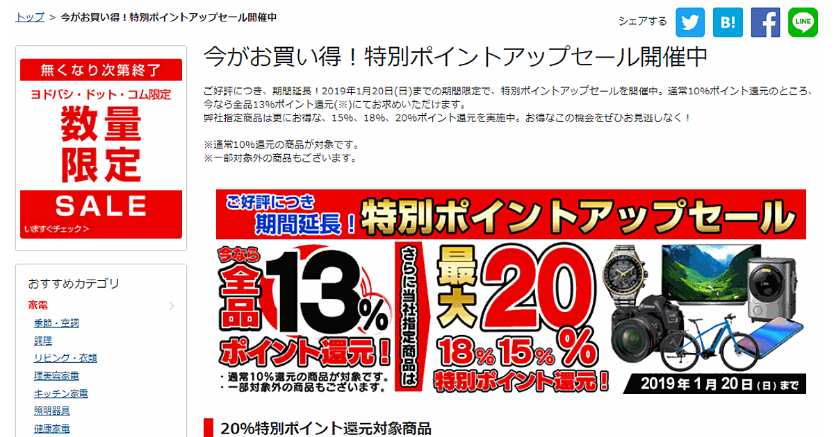 ヨドバシカメラは、12月22日からスタートした最大20%のポイントを還元する特別ポイント還元セールの延長を決めた。従来は12月31日までだったが、2019年1月20日まで延長する。